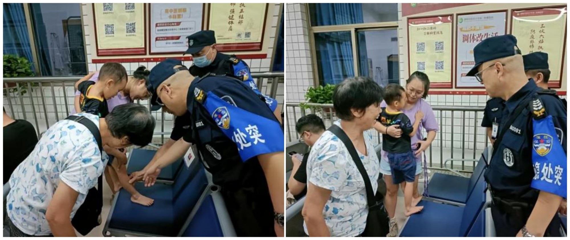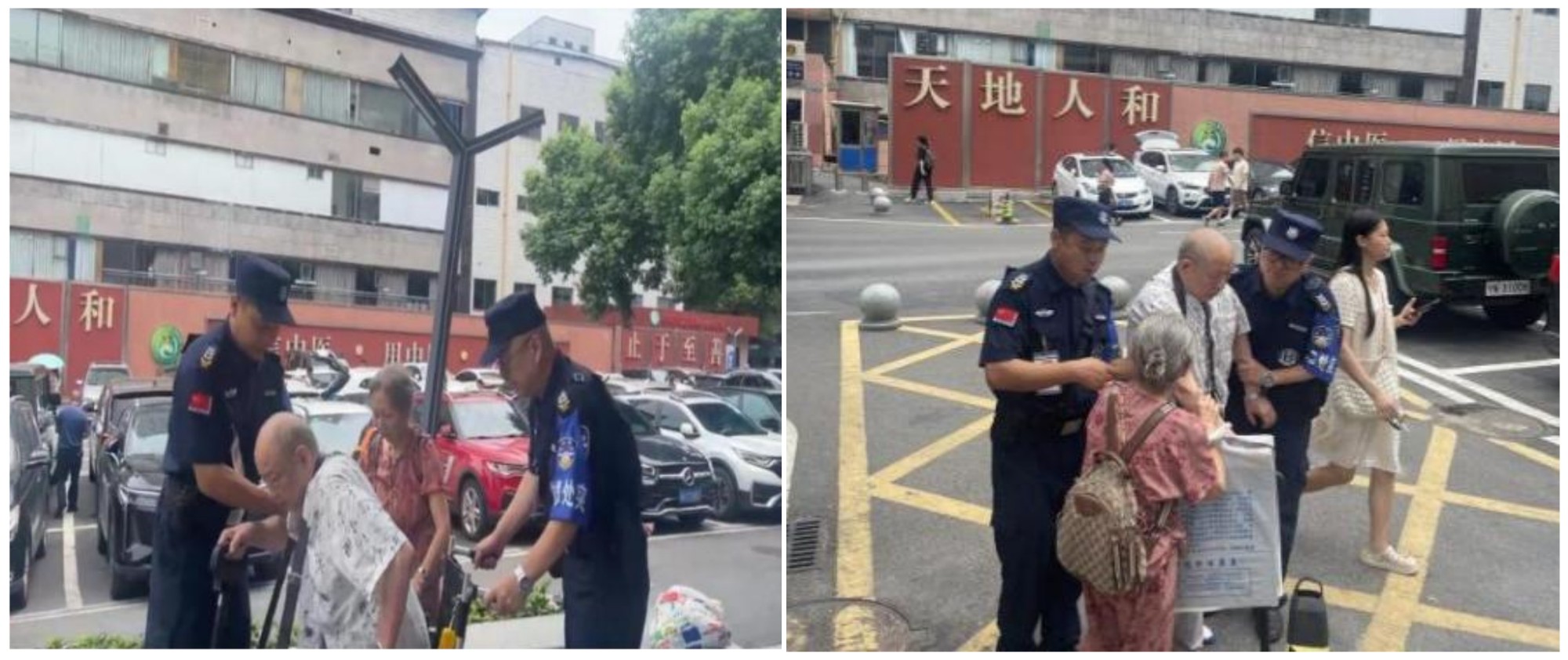 熊志强反应迅速,马上用对讲机唤来队友支援,和队友协力搀扶老人到门诊大厅前等待,一路小跑取来轮椅,两人小心翼翼搀扶老爷爷坐稳,并全程推行护送。安保人员一边轻声安慰,一边稳稳推车避开来往人群,直至将二老安全送达就诊区。
