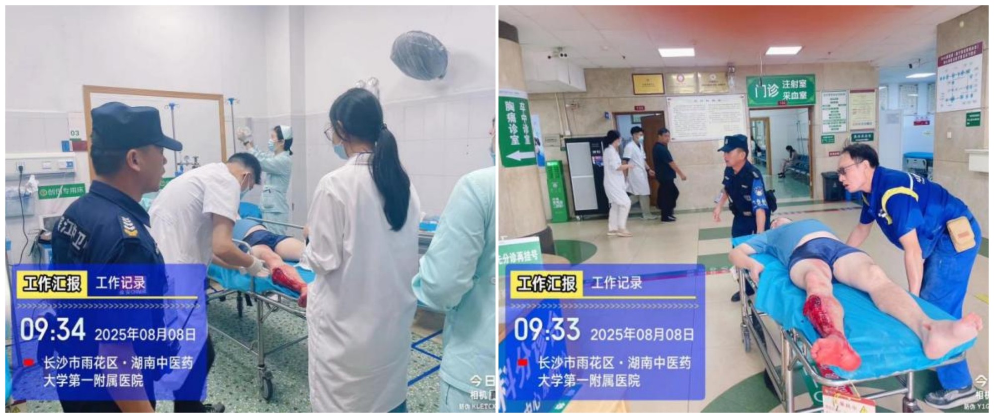 8月8日,对讲机里的呼叫声打破了清晨的平静。“应急处突队,门诊入口有重伤患者,请求支援!”应急队员闻讯立即冲向现场,只见一名面色苍白的患者瘫坐在地,右腿伤口血流不止,情况十分危急。“让一让!保持通道畅通!”队长一声令下,队员们迅速分工协作。有人立即疏散围观人群,为急救开辟生命通道;有人协助赶来的医护人员检查伤情。“慢一点,注意患者腿部!”在队员们的默契配合下,患者被平稳转移至担架车上。“急诊室已准备就绪!”对讲机里传来回应。队员们一路小跑护送,不时安慰患者:“坚持住,马上就到!”从门诊到急诊的200米距离,他们用专业和速度为患者抢回了最宝贵的抢救时间。